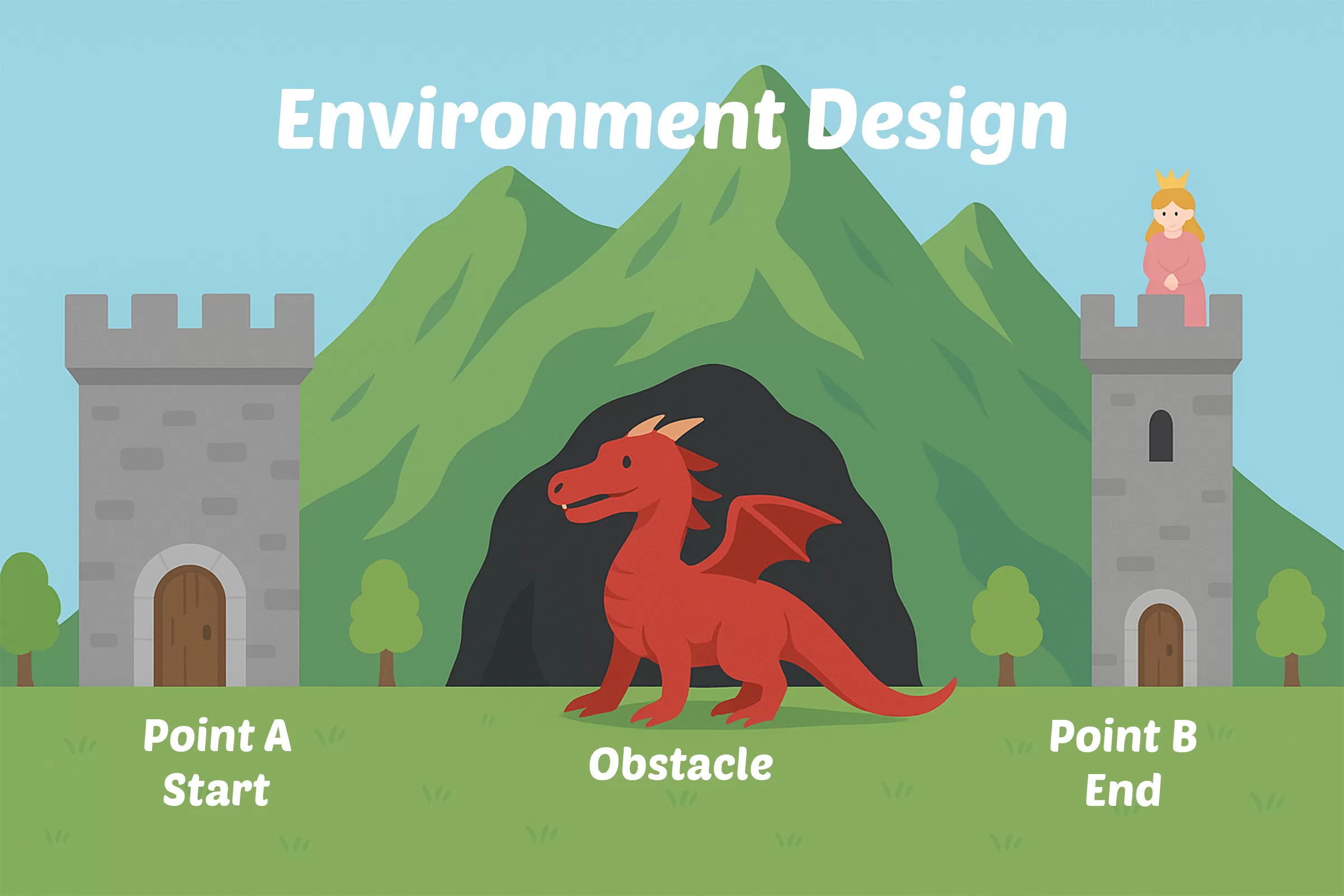 An environment is the setting of the level. It includes how everything looks, sounds, and feels. This can affect the mood and tone of the game.
