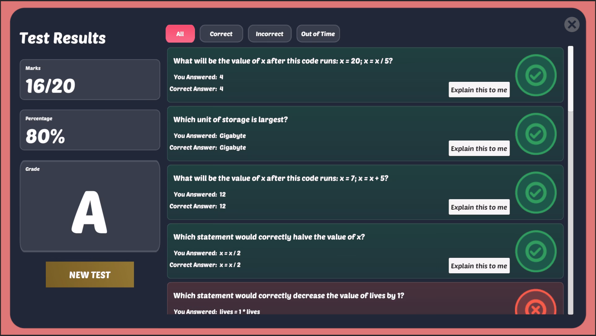 Previously, the results screen provided only a simple overview. It has now been enhanced to allow learners to filter their results in more useful ways. Pupils can now choose to view: